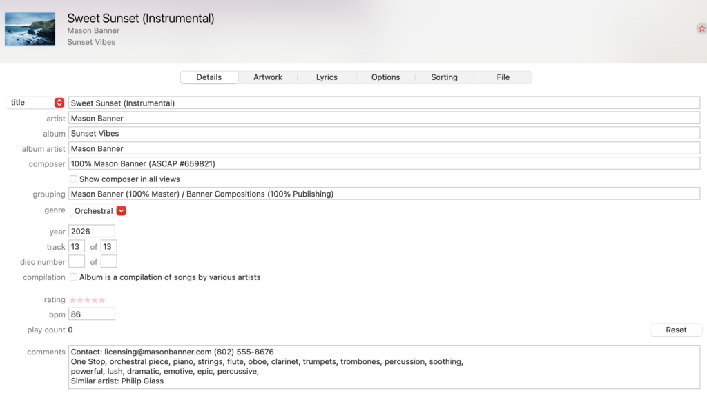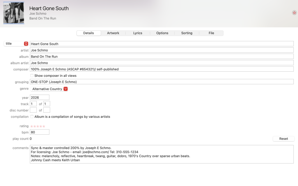 Metadata is the critical information about your track that a music supervisor needs to make a decision about whether to use it. It includes details beyond the song name and artist—such as copyright holders and contact information. If you don’t include metadata in your song file and send out untagged songs, a music supervisor won’t know who you are or how to reach you, making it nearly impossible for them to license your track.